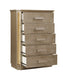 The 5-Drawer Chest is the epitome of style and organization. Its five spacious drawers provide a well-organized storage solution, and the LED Light Accent enhances its charm. This chest features a dazzling gold and copper finish with a distinctive snake skin finish, making it a standout piece in your bedroom. • Five spacious drawers for organized storage. • Elegantly adorned with LED Light Accent. • Dazzling gold and copper finish with a snake skin finish. • Durable and reliable manufactured wood construction.